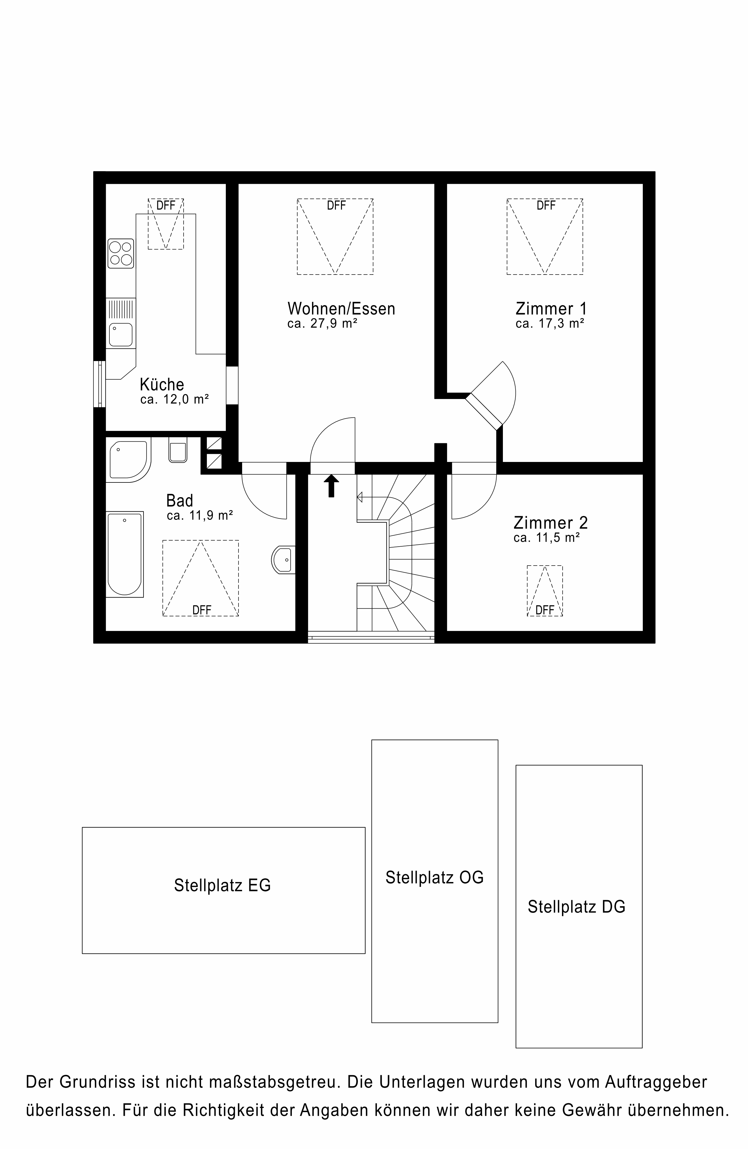 Der Grundriss ist nicht maßstabsgetreu. Die Unterlagen wurden uns vom Auftraggeber überlassen. Für die Richtigkeit der Angaben können wir daher keine Gewähr übernehmen.