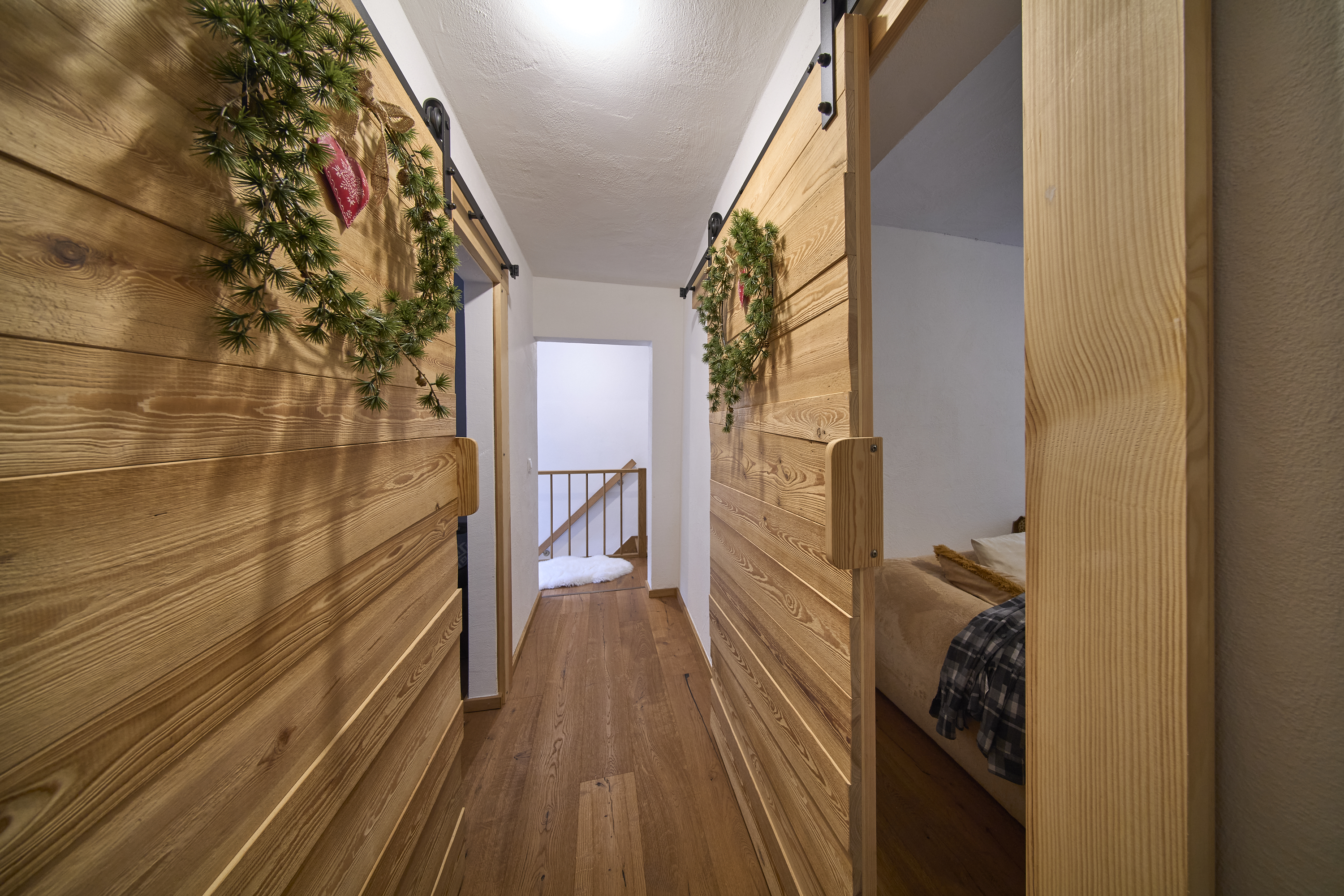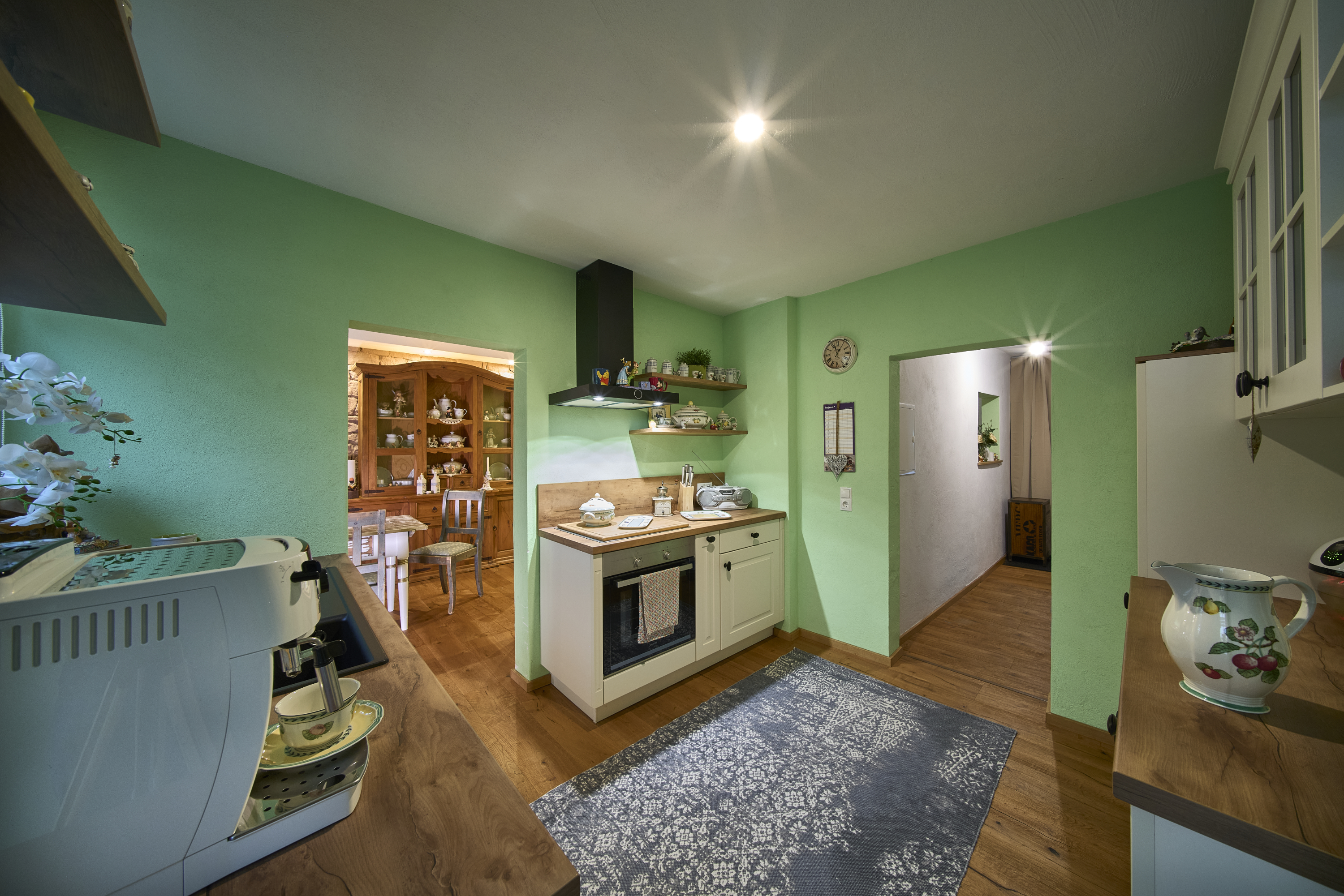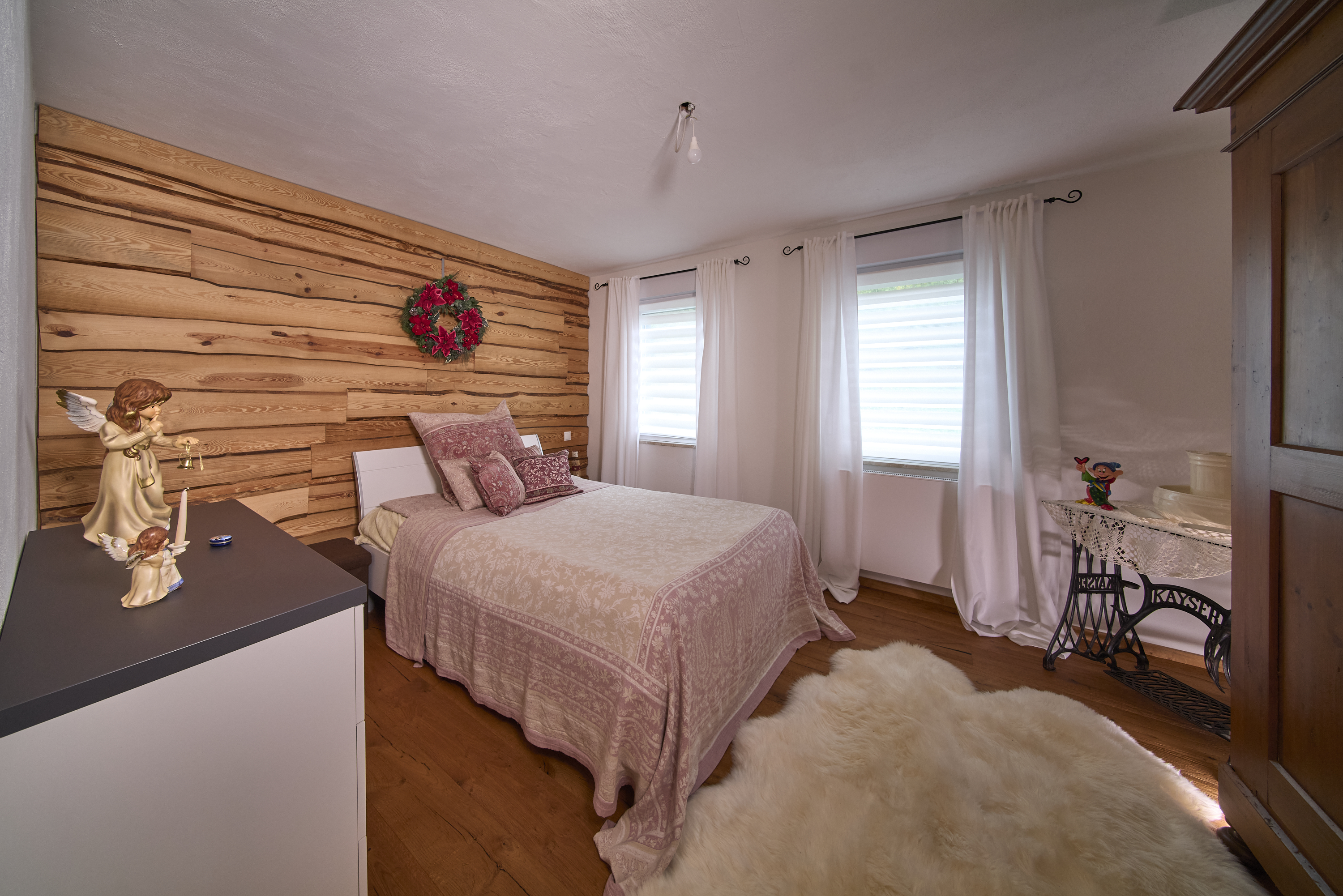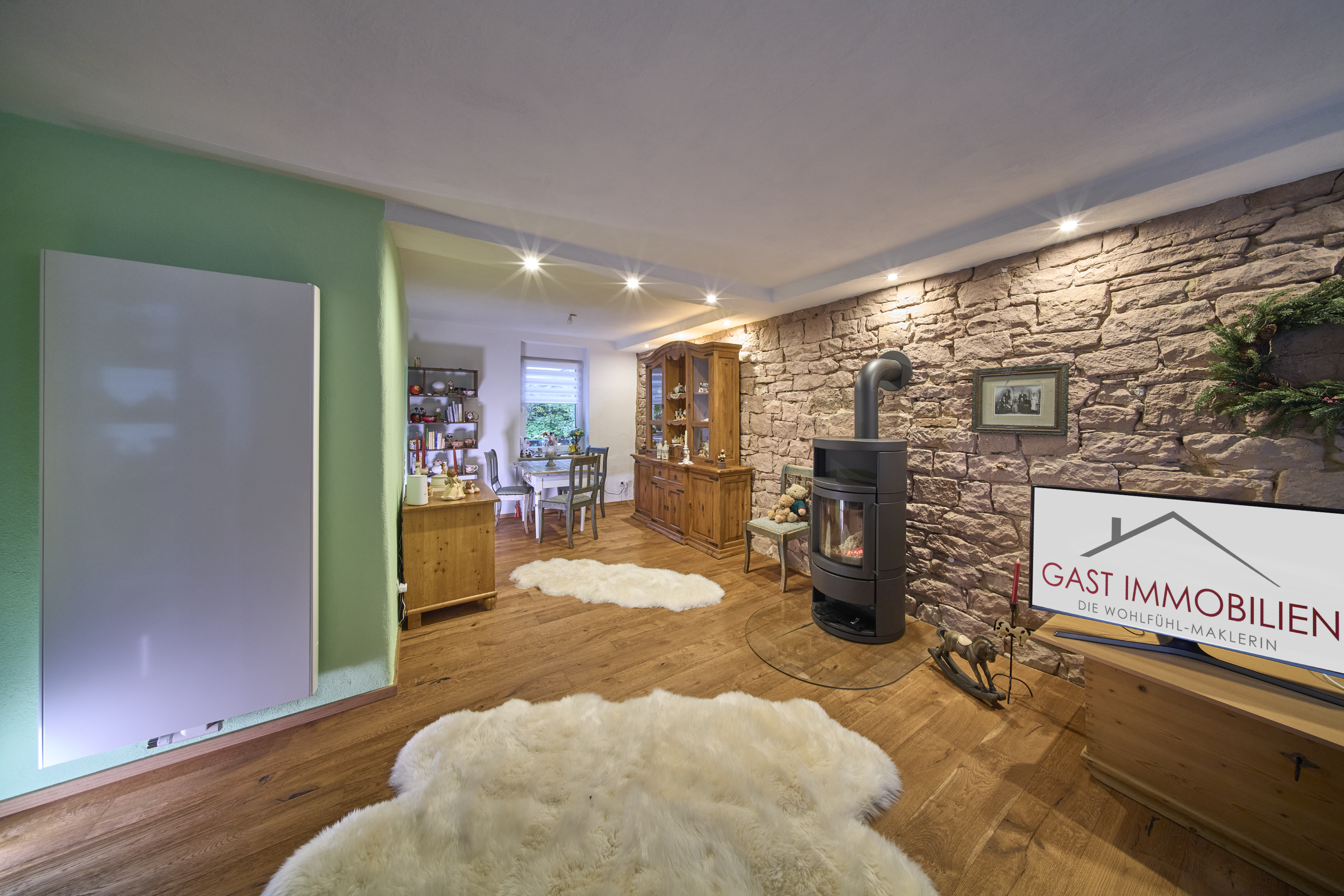 Entstanden ist ein wahres Wohnidyll mit sehr charmanter Gestaltung im Landhausstil mit viel Holz. Das Wohnzimmer wurde darüber hinaus mit einem hochwertigen Kaminofen mit Edelstahl-Außenkamin ausgestattet.