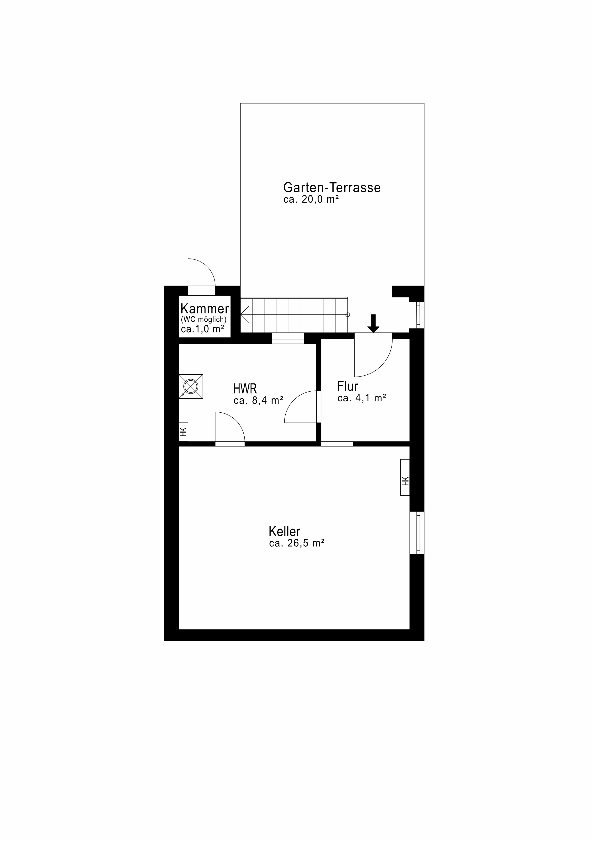 Durch die Geländelage hat die Ebene des Kellers eine weitere Terrasse sowie einen Außenraum mit Toilettenanschluss.