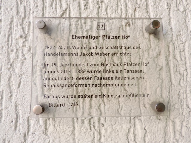 Der ehemalige Tanzsaal entstand gemäß Liste der Kulturdenkmäler 1886 als Neurenaissancebau und die Hausfront mit Jahrgangsstein ist erhalten.